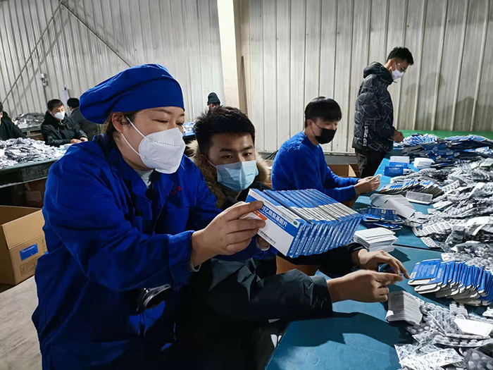 常務(wù)副總經(jīng)理王顥介紹道:“受新冠疫情影響,生產(chǎn)任務(wù)較往年更加緊張,積累的訂單也較多,尤其是抗病毒、退燒類口服固體制劑產(chǎn)品訂單劇增。為此公司科學(xué)部署,一方面協(xié)調(diào)渤海分公司部分人員來(lái)支援固體車間,同時(shí)安排天成藥業(yè)、道恩藥業(yè)后勤管理人員分時(shí)段參與包盒;另一方面調(diào)整招聘策略,擴(kuò)招一批臨時(shí)包盒工,緩解生產(chǎn)壓力。”